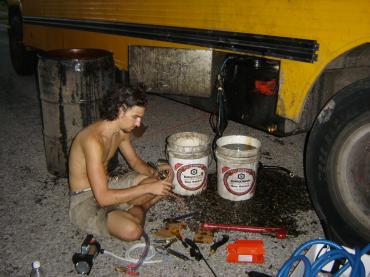 The five of us were college students in Corpus Christi, Texas who were looking for something exciting to be a part of. We all wanted to travel, and wondered if there was some way to reduce our fuel costs and emissions. After researching and finding out that Rudolf Diesel himself originally advocated vegetable oil to fuel his engine, we decided to pick up a bus from an auction. We then found and worked with a conversion company to install a heated fuel system that would allow us to fuel our journeys with used cooking oil filtered from restaurants.