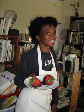 Eco-Villager Melba Thorn shows off her vegan chocolate strawberries—a small business she started at LAEV and markets nationally via Native Gardens.