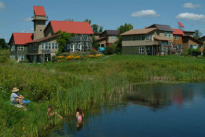 EcoVillage at Ithaca, Inc., a 501(c)(3) nonprofit, owns all the property outside the boundaries of the cohousing neighborhoods. Each of the community’s cohousing neighborhoods owns its buildings and (except for SONG neighborhood) owns the land beneath it: the FROG Housing Co-op, SONG Housing Co-op, and TREE Housing Co-op. The EcoVillage at Ithaca Village Association (EVIVA) is a non-exempt nonprofit which owns and manages roads, water and sewer lines, parking lots, swimming pond, and the land immediately around the FROG and TREE neighborhoods. The Center for Transformative Consciousness, a second 501(c)(3) nonprofit, was instrumental in developing each neighborhood and runs the community’s educational programs.